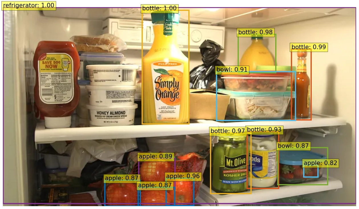 For another example, here's a photo of my friend's fridge and how it was parsed. It handles bottles extremely well, as likely that's one of the main labels the model is trained with, but it struggles with things like cartons.